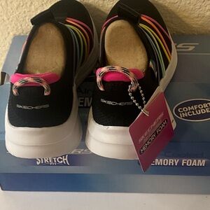 Skechers sneakers in black with multicolor straps. Features memory foam for comfort.