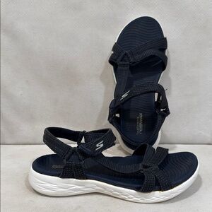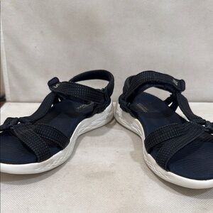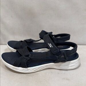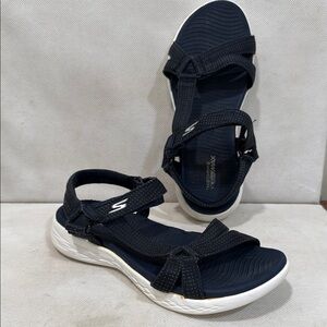 Experience ultimate comfort and style with these Skechers blue sandals, designed for active wear. Featuring a cushioned footbed and adjustable velcro straps, these sandals ensure a secure fit and all-day comfort. The durable synthetic material and lightweight sole make them perfect for casual outings and adventures. The sandals are in very good condition. Please see all photos.