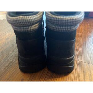 Features suede and fabric upper, fabric linings, padded collar and tongue, shock-absorbing midsole, flexible rubber traction lug outsole, and air-cooled memory foam cushioned footbed. Lace-up design, color Black, size 6.5 US.