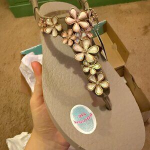 Add a touch of flower power to your look in Skechers Cali® Meditation - Glass Daisy. This casual thong style with stretchable slingback strap features a synthetic nubuck-textured upper with rhinestone and metal flower details, plus Yoga Foam comfort footbed. Brand new, never worn, in original box.