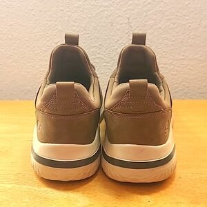 Tan Skechers slip ons Classic Fit with memory foam insole.