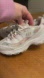 These white athletic shoes feature pastel rainbow and iridescent accents. Wide fit, cooled Memory Foam insoles.