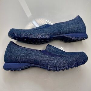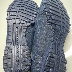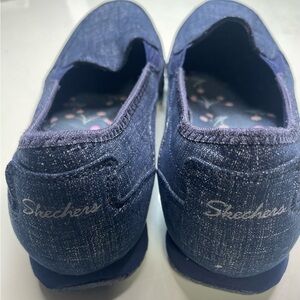 Casual denim blue slip-ons by Skechers. Perfect for everyday comfort.