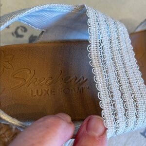 Chic Skechers sandals with silver straps and brown base. Perfect for casual outings. Comfortable and stylish.