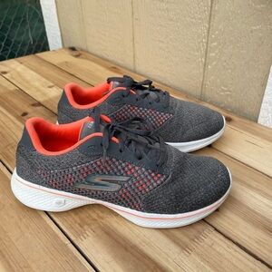 Sleek Skechers sneakers with gray exterior and neon orange interior. Ideal for active lifestyles.