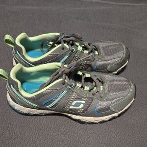 Stylish Skechers athletic shoes. Gray with blue accents. Comfortable and durable design.