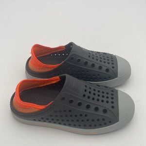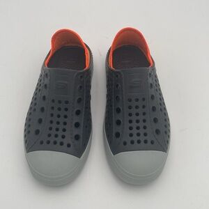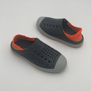 These stylish kids' slip-on shoes feature a sleek black design with vibrant orange accents. Perfect for active play, they offer comfort and easy wear.