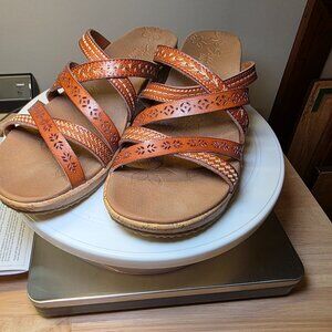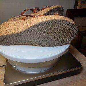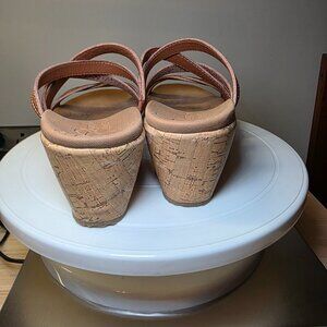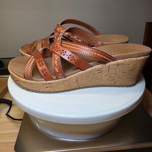 Gently used pair of Skechers Sandals. Wedge Heel is 2.5 inches, and the toe platform is 1 inch. Cork wedge making these very light shoes.