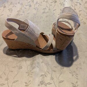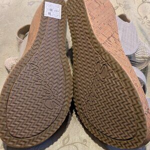 Skechers Luxe foam women's beige textile wedge sandal heel, size8, pre-owned condition excellent, comfortable, cute, straps/ elastic detail, stylish, wedge, cork, nice look, heels-2.75in, see photo