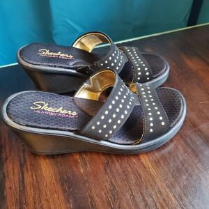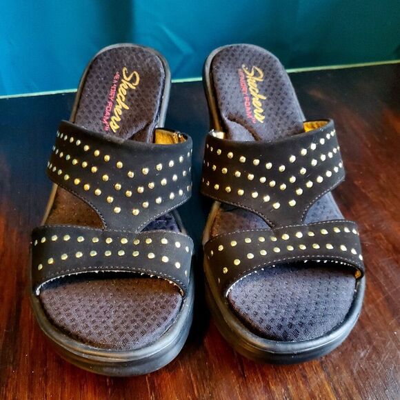 Skechers Memory Foam Black with gold studded accent Wedge/Slides 6