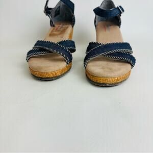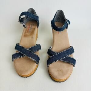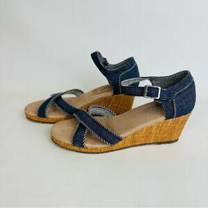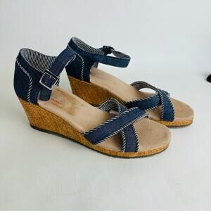 Skechers Memory Foam Womens Wedge Sandals Strap Buckle Denim Blue Size 9