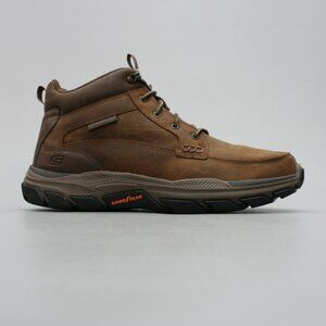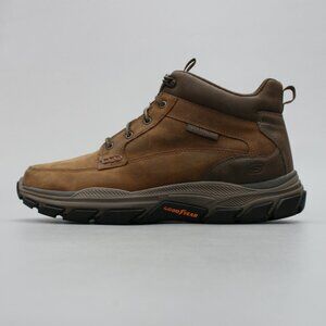 A pair of men's Skechers Respected-Boswell brown leather moc-toe lace-up trail hiking work boots.