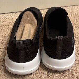 Breathable black mesh slip-ons. Features a cushioned white sole. Ideal for everyday comfort.