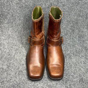 Skechers motorcycle boots men's brown leather harness strap buckle square toe moto western inside zip boots in excellent gently used condition!