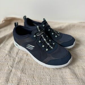 Stylish navy sneakers with white accents from Skechers. Comfortable and versatile. Perfect for everyday wear. Size 8. Lightly worn.