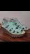 Step out in style with these chic mint green wedge sandals. Perfect for any occasion, they offer both comfort and elegance. Suede uppers. Comfy, cushioned footbeds. Adjustable straps with hook and loop closurees.