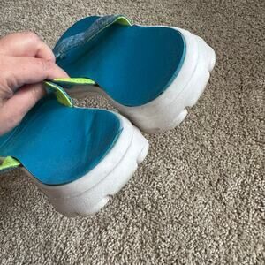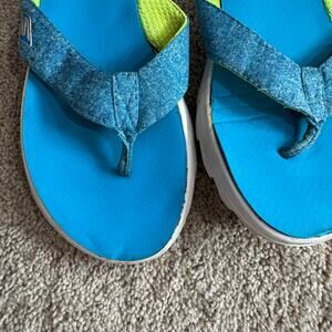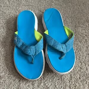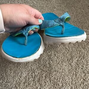 Skechers Performance Women's Go Walk Move Solstice Flip Flop Sandals in Size 9. Sporty, manufacturer calls this blue color Turquoise, open toe, thong sandals, thick but soft footbed. Sandals are in good used condition with small signs of wear, but lots of miles left in them. Please see close-up pictures for condition details and heel measurement. Easy on and off, slip on, beach, summer, beachy, pool, cruise, swimming, comfort shoes, every day, walking sandals.