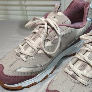 Experience the perfect blend of style and comfort with Skechers sneakers, featuring a vibrant pink/rose and gray color scheme. These sneakers are designed with a supportive sole, air cooled memory foam shoes, absolutely like new, beautiful shoes, they are the D'Lites edition with little shiny stones...ideal for both casual outings and athletic activities. The breathable mesh panels and secure lacing system ensure a snug fit for all-day wear.