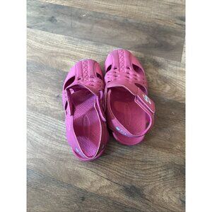 The Skechers Sandal Girls US 12 in Pink features an almond toe shape with a hook and loop closure for easy wear. Ideal for travel and casual occasions, these boat style sandals are water resistant and have a synthetic outsole. The ankle strap adds a secure fit, while the flat heel design provides comfort for all-day wear. Perfect for beach activities, these sandals are a stylish and practical choice for young girls.