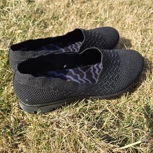 preowned. clean. into comfort with these stylish black slip-on shoes. Perfect for any casual outing.