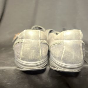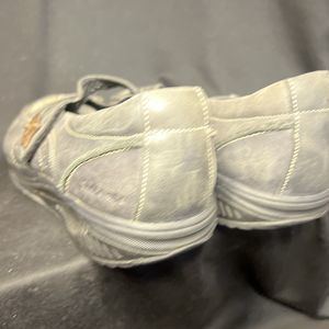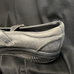 Description: Skechers Shape Ups Gray-Black Suede Leather - Cutouts, Embroidered, Wooden Button Design, Velcro Strap Mary Jane Comfort/Fitness/Exercise/Rocker Sole Shoe