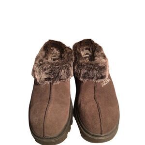 Skechers Shindigs Fortress women’s size 7 slip on clogs, slippers. Leather upper faux fur lining. Brown. SN 45703 Preowned like new condition