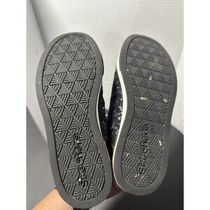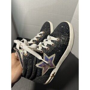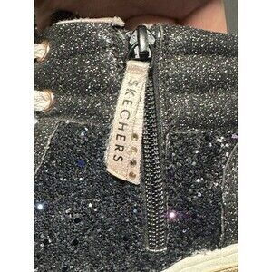 Step out in sparkly style with these Skechers Shoutouts 2.0 - Starry Glam high-top sneakers. Featuring a dazzling black glitter upper with an iridescent star appliqué on the side, these are perfect for adding a touch of flair to any outfit. The shoes have a convenient side zipper for easy on/off, along with classic white lace-up fronts. The interior is a soft pink lining, and the soles are durable Skechers rubber. A heart-shaped 'Skechers' logo is subtly placed on the tongue. In excellent used condition with minimal wear on the soles and glitterwork. 996-1