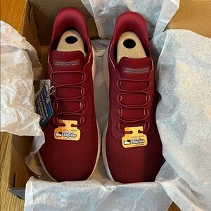Red Skechers Slip-Ins. Easy to wear. Machine washable.