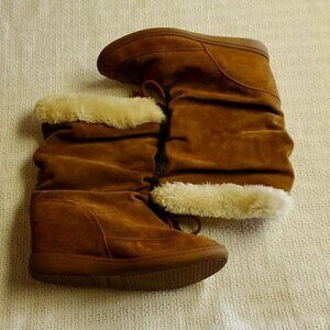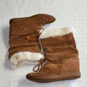 Skechers Sz. 8 Tan Suede Faux Fur Insulated Cinched Embellished Winter Boots