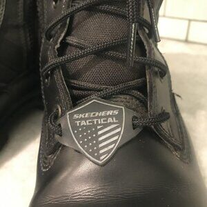 Branding/Markings: Skechers Tactical shield patch on tongue; HydroGuard waterproof systems woven tag; Skechers WIDE FIT SLIP RESISTANT branding on outsole; size/ASTM label inside