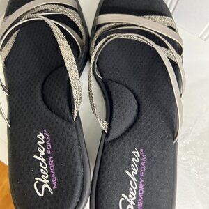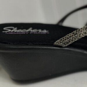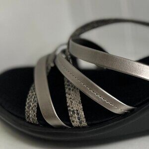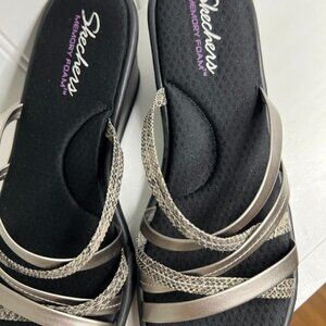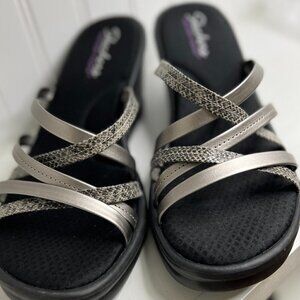 This strappy wedge slide sandal features a synthetic strap upper, glittering rhinestone details and a cushioned Luxe Foam® footbed.