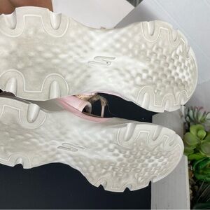 Sleek white athletic shoes by Skechers. Features a textured knit design.
