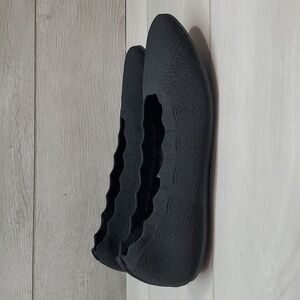 Soft stretchable woven fabric upperKnit fabric with nearly seamless designKnit-in texture designsSlip on casual dress comfort ballet flat designSolid colored fabric heel stripeStitching detail on heel overlayTapered toe frontLightly scalloped stretch fabric collar designSoft fabric shoe liningFabric topped insoleAir-Cooled Memory Foam cushioned comfort insoleFlat midsoleFlexible rubber traction outsole1/8 inch heelMachine Washable design - wash on gentle cycle cold, hang to air dry