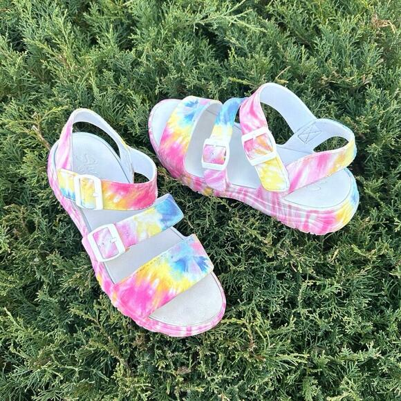 Preowned summer tye dye skechers sandals in good condition. Pictures taken outdoors to show true color.