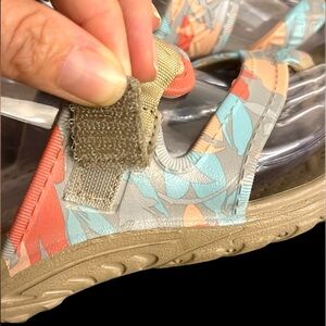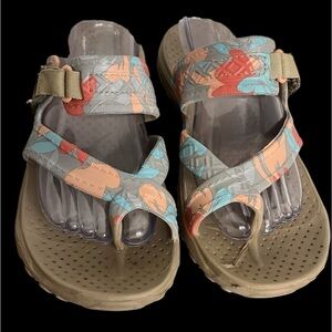 Vibrant Skechers sandals with coral and aqua accents. Perfect for the active outdoor life. Comfortable and durable design!