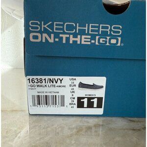 These are Skechers Women's Go Walk Lite Amore slip-on shoes in navy blue, size 11 with a comfortable mesh upper. They are designed for activewear, casual, and workwear occasions, featuring a rubber outsole for traction. The shoes are part of the Skechers GOwalk product line, known for their comfort and performance in walking activities.