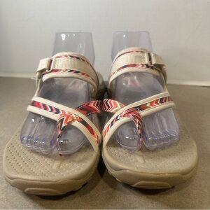 Lightweight sandals with Zig-zag design. Adjustable criss-cross strap with toe post. Cushioned comfy footbed. Rubber soles.