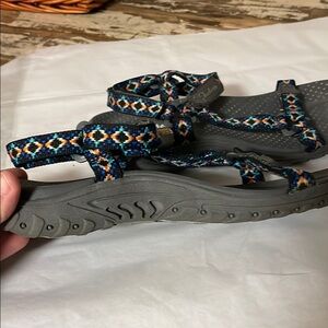 Stylish Skechers sandals with a multicolor strap design. Comfortable gray sole. Perfect for casual wear.