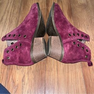 Stylish Skechers ankle boots in rich burgundy suede. Features lace-up design with metal eyelets. Perfect for casual wear.