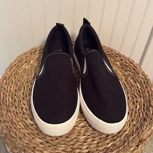 Stylish black slip-on sneakers with white soles. Perfect for casual wear.