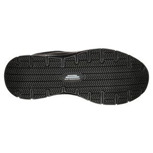The black Flex Advantage athletic shoes have a sport style that's also casual. A lace-up sneaker design is great for the workplace and beyond, and it's easy to get on and off. Smooth synthetic overlays at the laces add durability, and Skechers added stitching accents, side S logos, heel panel fabric overlays with pull-on top tabs, and durable textured air mesh with grid underlays for detailing and extra strength. The Bendon slip-resistant sneakers feature padded collars and tongues for exterior comfort, and soft fabric shoe lining makes sure the interiors are breathable. A Relaxed Fit® design gives you a roomier, comfortable fit, and the athletic SR shoes have impressive Memory Foam-topped cushioned full-length comfort insoles that are removable, too.