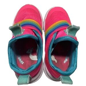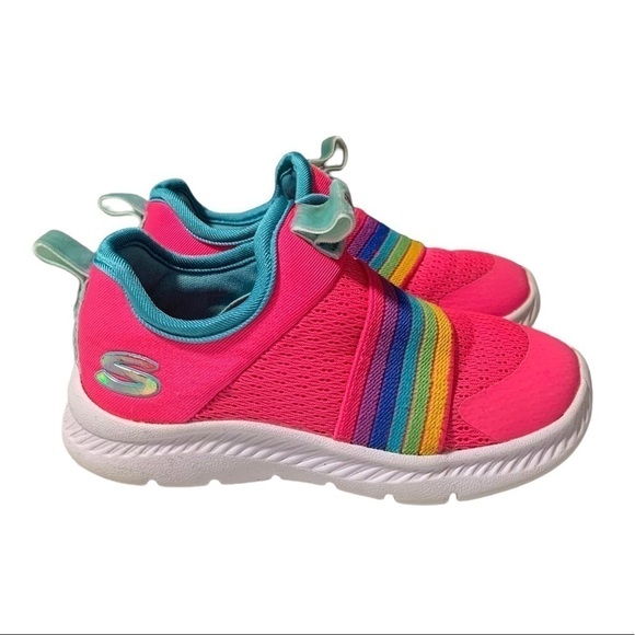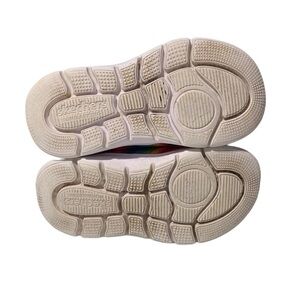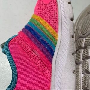 Skecher Comfy Flex 2.0 Rainbow Delight Slip on Girls Sneakers size 7 Pink. These do have some soiling on the inside soles. Two small spots. See pics. Smoke free home. Ships fast!