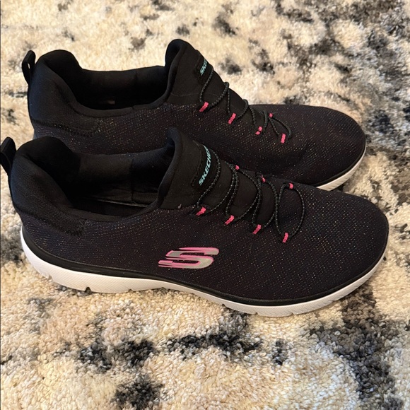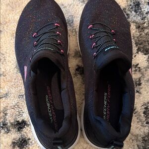 Stylish sparkly Skechers sneakers with black and pink design. Comfortable and supportive for everyday wear.