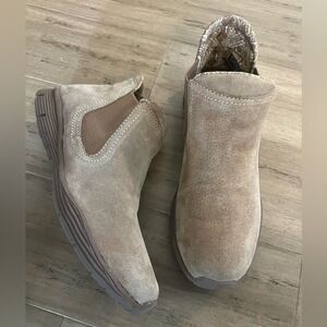 Skechers tan suede leather fabric lined women’s Chelsea ankle boots ! Size 9