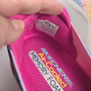 Bright multicolor tie dye. Comfortable sneakers with pink interior. Features Air Cooled Memory Foam for added comfort. Stretch fit knit uppers.