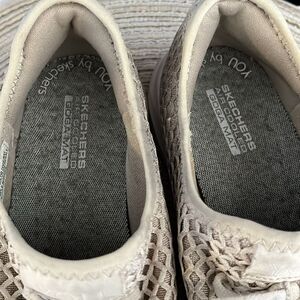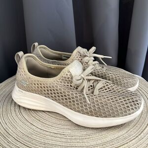 Skechers athletic shoes, tan sneakers, casual sports shoes, comfortable and supportive.
