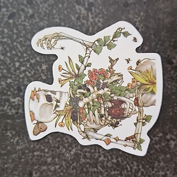 Skeleton Bones & Botany Sticker. New. Waterproof. Made from a high quality PVC. Use on laptop, phone, skateboard, journal, planner, notebook, water bottle, art projects, crafts, etc. Not recommended for use on a car or items that will be washed in a dishwasher. Adheres best to clean, non-porous surfaces. Ships from a smoke and pet free home.