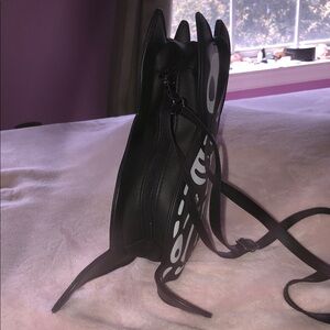 Unique skeleton cat-shaped backpack. Features black and white design. Perfect for adding a quirky touch to your outfit. Never used!