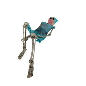0304B- skeleton doctor Halloween decoration ornament, 16” Tall, 5” Wide. Wears teal blue frayed scrubs with pink tinge in the center. White mask with red tinge. Gray bones. Blue scrubs hat. Movable joints, posable, Halloween decor, haunted house decoration, festival events, gently preowned. Excellent condition.