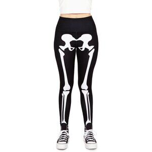 Features: High waisted, pull-on style leggings featuring a playful skeleton bone print. Made from a comfy 95% polyester and 5% spandex blend, these leggings are perfect for spooky events, costume parties, or everyday fun. They fit snugly with a flattering high rise and stretch easily.